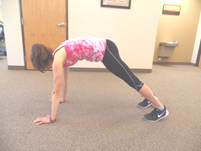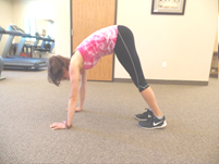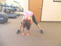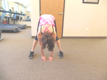 Start on your hands and knees. Round your back and “push” the floor away from you, spreading your shoulder blades apart. Straighten your legs and allow your heels to relax back. Take short steps and walk your feet towards your hands. You should feel your abs engage and your calves and back stretch. Take 5 deep breaths. Walk your hands out and repeat 4 more times.